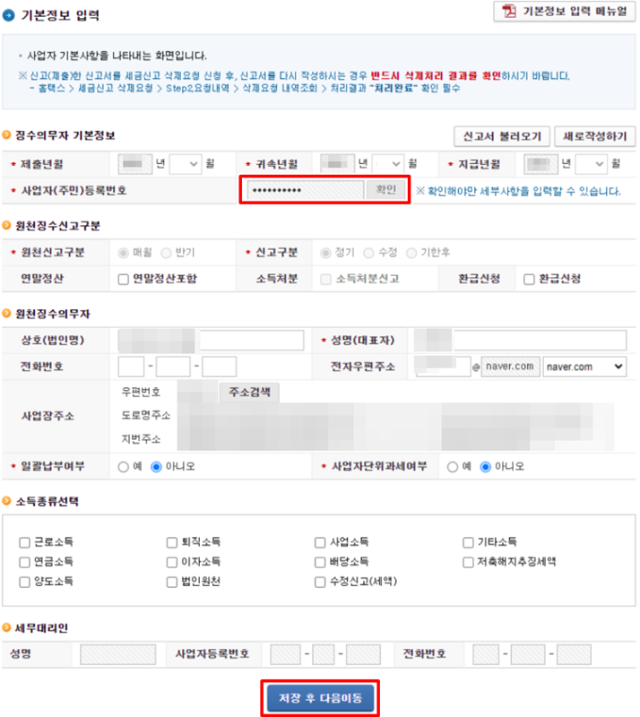 4. 기본정보를 입력하는 화면에서는 사업자(주민)등록번호를 확인하고 귀속년월과 지급년월 등을 정확하게 기입합니다. 모든 정보를 입력한 후 '저장 후 다음이동'을 눌러줍니다.