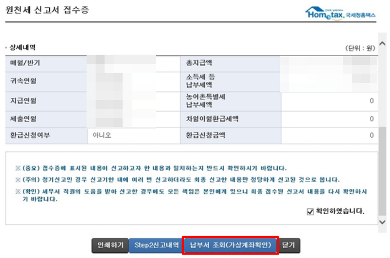 9. 신고서 제출이 완료되면 접수증을 확인할 수 있습니다. 접수 내용을 최종적으로 확인하고, 납부할 세금이 있다면 '납부서 조회'를 통해 가상계좌 등을 확인하여 납부를 진행하면 모든 절차가 마무리됩니다.
