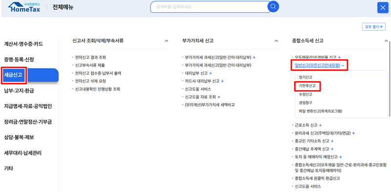 2. 전체메뉴가 나타나면 좌측의 '세금신고'를 선택하고, 이어서 종합소득세 신고 항목 중 '일반신고' 아래에 있는 '기한후신고'를 찾아 들어갑니다. 정기신고 기간을 놓쳤을 경우 이 메뉴를 이용합니다.