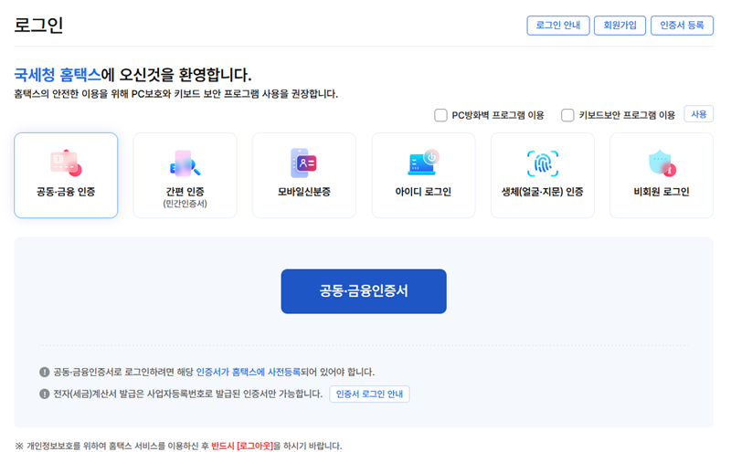 3. 신고서 작성을 위해서는 로그인을 통한 본인 확인이 반드시 필요합니다. 여러 인증 방법 중에서 안전한 신고를 위해 공동·금융인증서를 사용하여 로그인 절차를 완료해 줍니다.