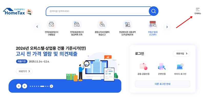 1. 국세청 홈택스 홈페이지에 들어간 후, 우측 상단에 위치한 '전체메뉴'를 선택하여 모든 세무 관련 업무 목록을 펼칩니다. 이곳에서 종합소득세와 관련된 항목을 찾아 들어갈 수 있습니다.
