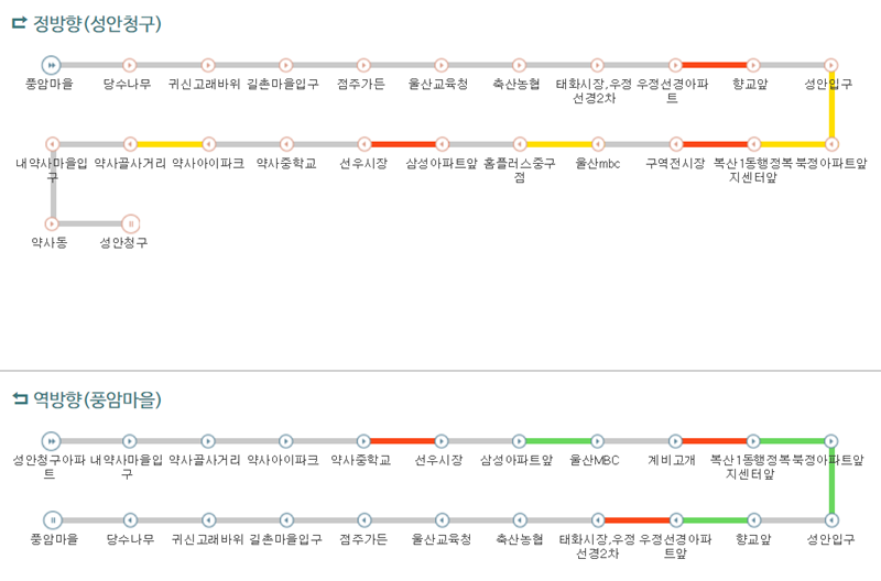 4. 노선 상세 정보에서는 정방향과 역방향 노선도를 따로 보여주어 양방향 운행 경로를 명확하게 확인할 수 있습니다. 각 방향의 전체 정류장 목록이 그림으로 표시되어 전체적인 흐름을 이해하기 쉽습니다.