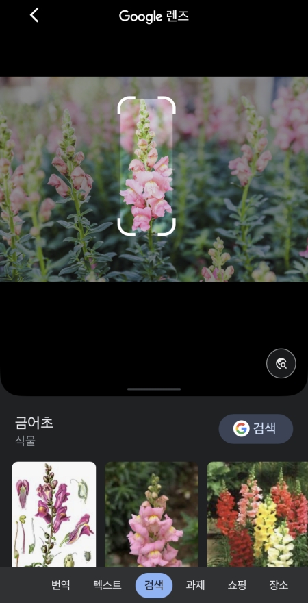 8. 카메라로 식물을 비추면 잠시 후 화면에 해당 식물의 이름이 나타나고, 관련된 추가 정보나 비슷한 이미지들을 함께 확인할 수 있습니다.