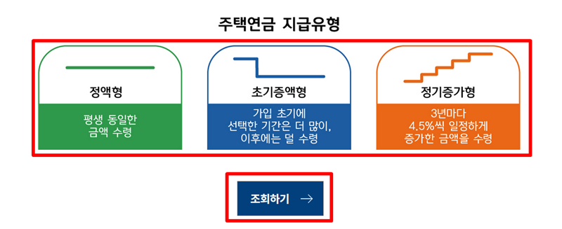 5. 수령액 지급 유형을 선택한 후 조회를 진행합니다. 매달 같은 금액을 받는 '정액형', 초기에 더 집중적으로 받는 '초기증액형' 등 다양한 유형 중에서 하나를 고를 수 있습니다.