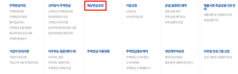 2. 주택연금 세부 항목 중에서 '예상연금조회'를 찾아 들어가면 월 지급금을 미리 계산해 볼 수 있는 화면으로 이동합니다. 이곳에서 본격적인 조회를 시작할 수 있습니다.