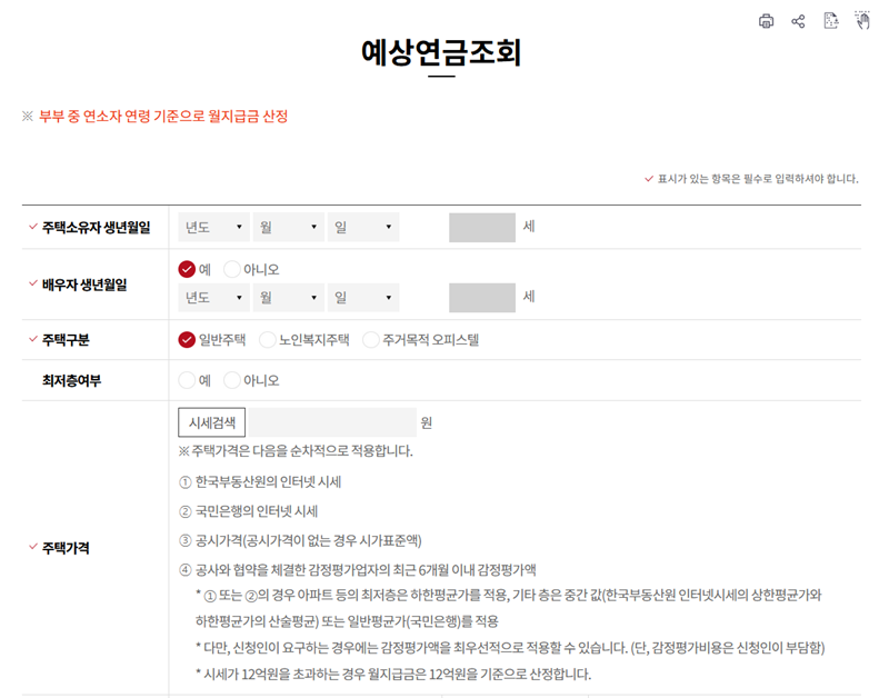 3. 조회 화면이 나타나면 주택 소유자와 배우자의 생년월일, 주택 종류 및 현재 시세 등 기본적인 정보를 입력합니다. 모든 항목은 필수이므로 빠짐없이 기입해야 합니다.