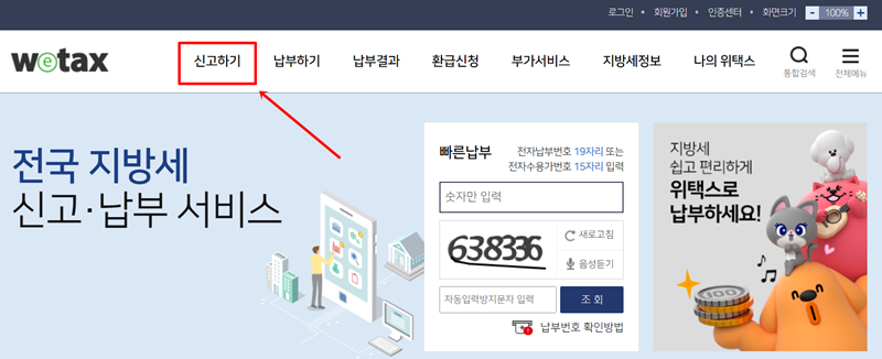 1. 홈페이지 상단에 있는 주 메뉴에서 '신고하기' 항목을 찾아 들어갑니다. 이곳에서 각종 지방세와 관련된 다양한 업무를 시작할 수 있으니 잘 확인해 주세요.