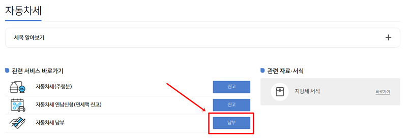 3. 자동차세 페이지로 이동하면 관련된 여러 서비스가 나타납니다. 여기서 '자동차세 납부' 항목을 찾아 옆에 있는 '납부'를 선택하여 다음 단계로 진행합니다.