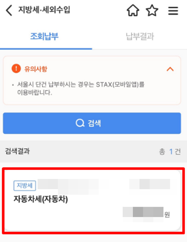 8. 조회가 완료되면 납부해야 할 자동차세 항목이 목록에 나타납니다. 이 항목을 선택하면 상세한 내역을 확인하고 납부 절차를 계속해서 진행할 수 있습니다.