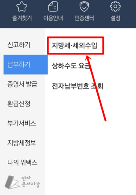 7. 전체 메뉴가 열리면 '납부하기'를 선택하고, 그 아래에 있는 '지방세·세외수입' 항목으로 들어갑니다. 이곳에서 자동차세를 포함한 모든 지방세 내역을 확인할 수 있습니다.