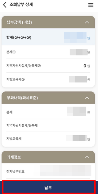 9. 상세 화면에서는 본세와 지방교육세 등 세금의 구체적인 구성 내역을 살펴볼 수 있습니다. 내용을 꼼꼼히 확인한 후, 화면 하단에 있는 '납부' 부분을 눌러주세요.
