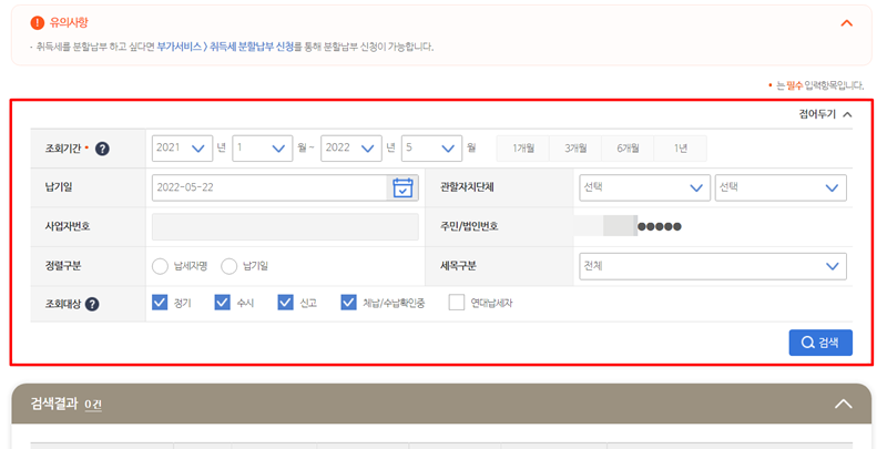 5. 로그인을 마치면 조회 기간을 설정하고 필요한 정보를 입력하여 납부할 내역을 찾아볼 수 있습니다. 조건을 설정한 뒤 검색하면 해당 기간의 세금 내역이 나타납니다.