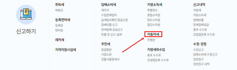 2. '신고하기'의 여러 세금 항목 중에서 지방소득세 카테고리에 있는 '자동차세'를 찾아 들어갑니다. 취득세, 등록면허세 등 다양한 항목이 있으니 정확히 선택해야 합니다.