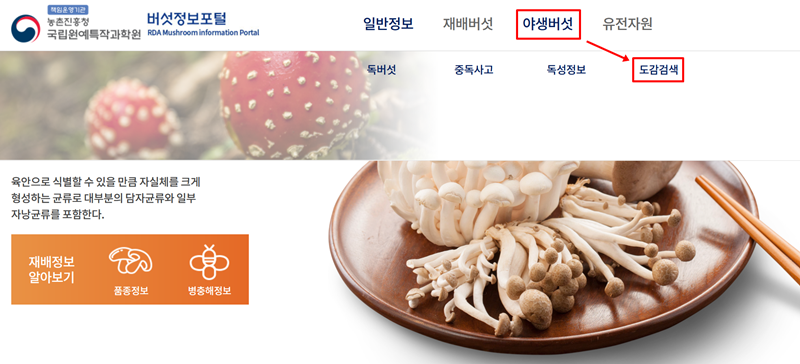 1. 먼저, 알려드린 '버섯정보포털' 홈페이지에 접속해 보세요. 화면 위쪽에 보이는 여러 메뉴 중에서 '야생버섯'이라는 항목에 마우스를 가져가시면, 그 아래로 '도감검색'이라는 메뉴가 나타날 거예요. 이 '도감검색'을 클릭해서 이동하면, 본격적으로 우리가 궁금해하는 다양한 버섯 정보를 속 시원하게 찾아볼 수 있는 페이지가 활짝 열린답니다.