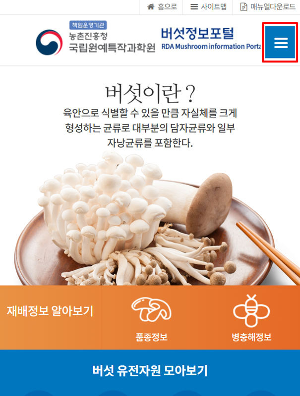 7. 요즘은 컴퓨터보다 스마트폰으로 인터넷을 더 많이 이용하시죠? 버섯정보포털은 모바일 환경에서도 아주 편리하게 이용할 수 있도록 잘 만들어져 있습니다. 스마트폰으로 접속했을 때 화면 오른쪽 위에 보이는 메뉴 버튼(보통 줄 세 개 모양 아이콘)을 누르면, 컴퓨터에서 보았던 모든 메뉴가 보기 쉽게 나타나서 원하는 정보로 빠르고 간편하게 이동할 수 있답니다.