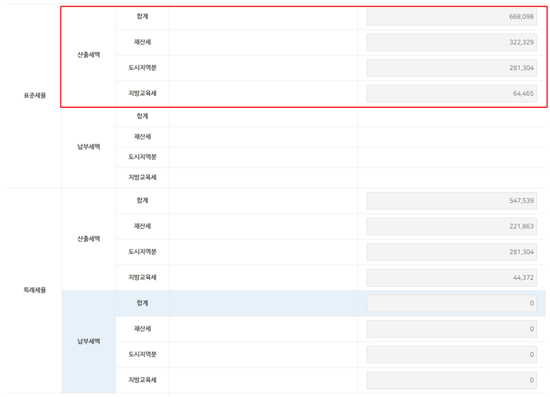 4. 계산을 마치면 표준세율을 적용했을 때의 산출세액 합계와 세부 항목을 한눈에 볼 수 있습니다. 재산세, 도시지역분, 지방교육세가 각각 얼마인지 상세하게 나타납니다.