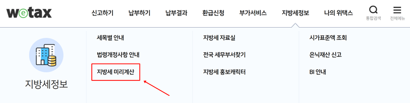 2. '지방세정보' 페이지로 이동하면 왼쪽에 '지방세 미리계산'이라는 항목이 있습니다. 여기로 들어가면 여러 종류의 지방세를 미리 계산해 볼 수 있어요.