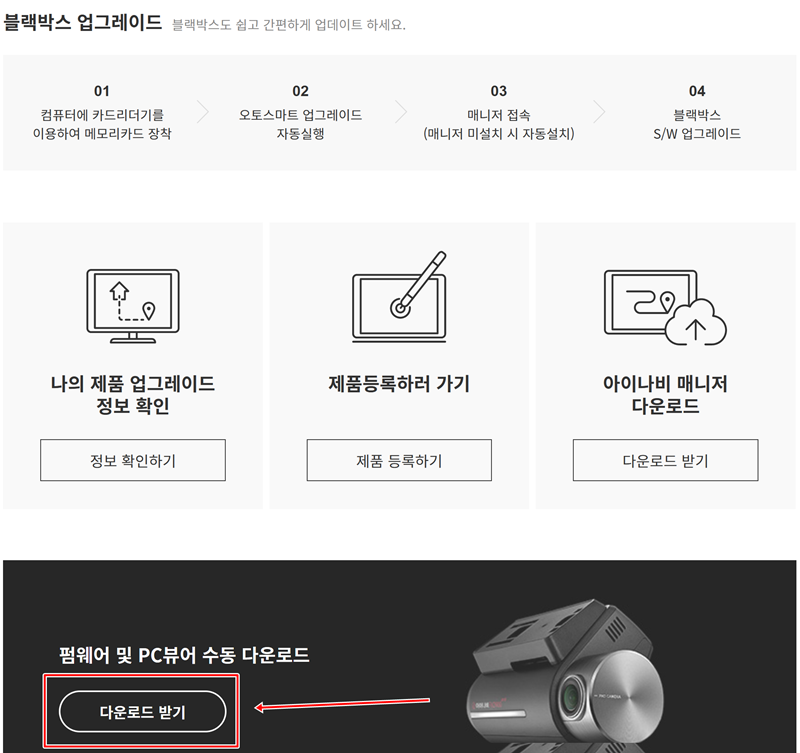 블랙박스 업그레이드 페이지에서는 자동 업데이트 방법과 수동으로 파일을 받는 방법이 안내되어 있습니다. PC에서 영상을 보시려면 '펌웨어 및 PC뷰어 수동 다운로드' 아래에 있는 '다운로드 받기'를 눌러주시면 됩니다.