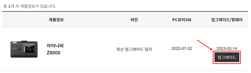검색을 통해 고객님의 제품 모델을 찾으셨다면, 오른쪽에 있는 '업그레이드' 부분을 선택해 주세요. 그러면 아래쪽으로 해당 모델의 펌웨어나 PC 뷰어 프로그램을 내려받을 수 있는 상세 정보가 펼쳐집니다.
