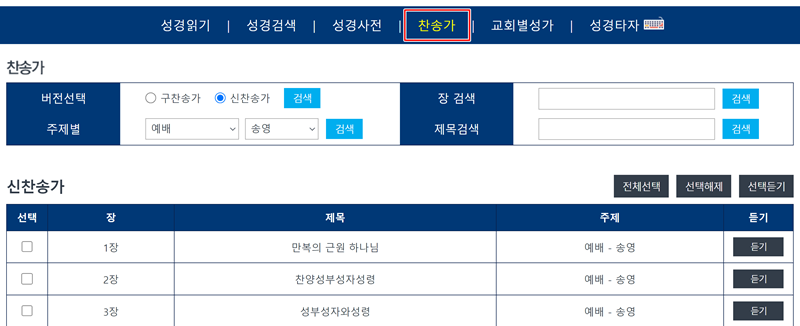 1. 홈페이지에 접속하면 상단 메뉴 중 '온라인성경찬송'이라는 항목이 있습니다. 이 부분을 통해 성경 읽기를 시작할 수 있는 페이지로 이동하게 됩니다.