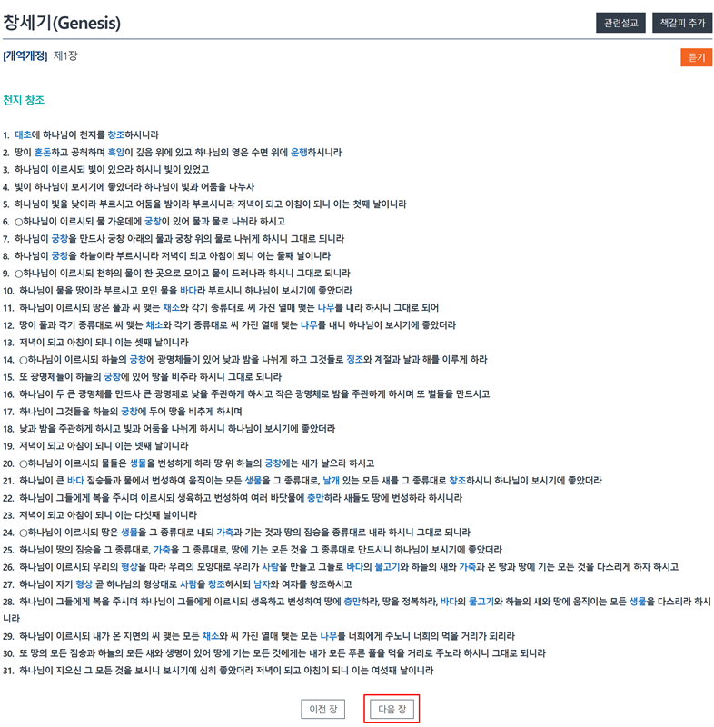 3. 선택한 장의 내용이 화면에 나타나면 천천히 말씀을 읽어 내려갈 수 있습니다. 다음 장으로 넘어가고 싶을 때는 아래에 있는 '다음장'을 이용해 계속해서 읽을 수 있습니다.