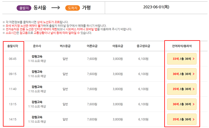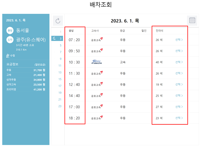 이제 원하는 시간대의 버스를 고를 차례예요. 동서울에서 광주로 가는 버스의 출발 시간과 남은 좌석 수를 확인하고, 나의 일정에 맞는 가장 적절한 버스를 선택하면 예매가 거의 다 끝난 셈이랍니다.
