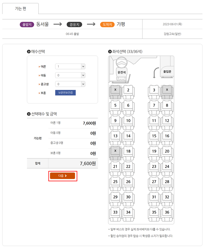 원하는 버스편을 골랐다면 이제 인원수를 정하고 좌석을 선택할 차례입니다. 인원을 맞게 조절한 후 좌석 배치도로 이동하여 자리를 정해주세요.