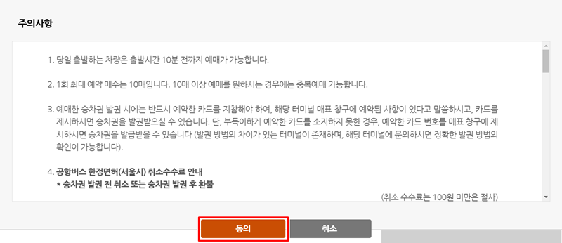 버스표 예매 시에는 취소 수수료와 관련된 주의사항을 반드시 확인해야 합니다. 내용을 충분히 이해하고 난 뒤 '동의'를 선택해 주세요.