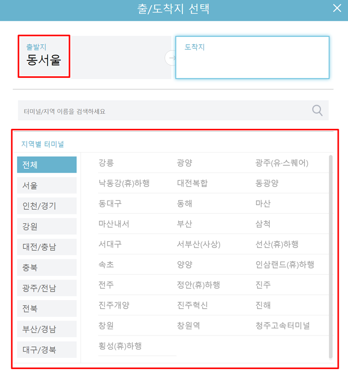 출발지를 선택하는 화면에서 '서울' 지역을 누르고 목록에 나타난 '동서울'을 선택해 주세요. 여러 터미널 중에서 내가 이용할 곳을 정확히 고르는 것이 중요하며, 이렇게 출발할 곳을 확정 짓습니다.