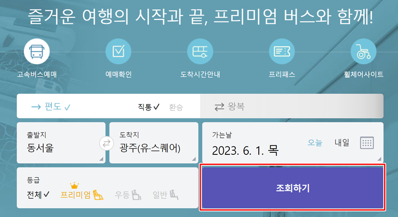 출발지와 도착지를 정하고 가는 날짜까지 선택했다면 이제 '조회하기'를 눌러주세요. '동서울'에서 '광주(유・스퀘어)'로 가는 버스편을 찾아보는 과정이랍니다.