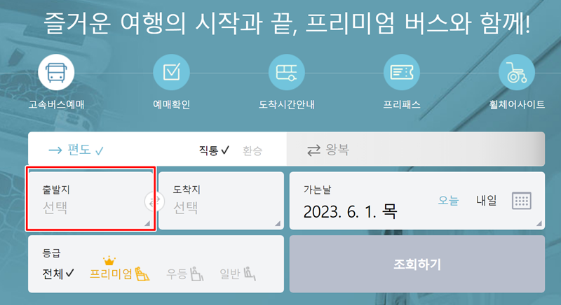 고속버스 예매 과정의 첫 단계는 바로 '출발지'를 정하는 것입니다. 화면에 보이는 '선택' 영역을 눌러 내가 출발할 터미널을 고를 준비를 합니다. 여러 지역 중에서 내가 있는 곳을 정확히 지정하는 것이 중요해요.