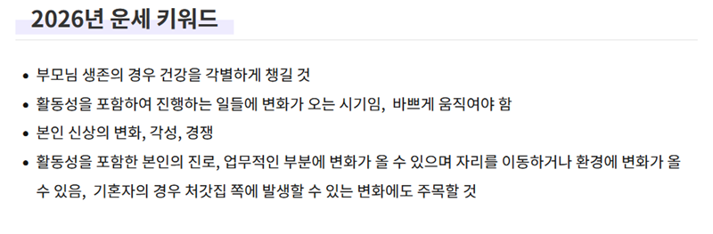 4. 2026년 운세의 핵심적인 내용을 키워드로 요약해서 보여줍니다. 건강, 활동, 진로 등 어떤 부분에 변화가 있을지 미리 짚어주어 전체적인 흐름을 이해하는 데 도움이 됩니다.
