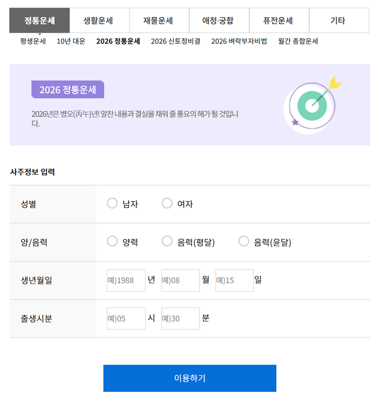 2. 자신의 사주 정보를 정확하게 입력하는 화면으로 이동합니다. 성별, 양력 또는 음력 생년월일, 그리고 태어난 시간까지 꼼꼼하게 기입한 후 '이용하기'를 누릅니다.