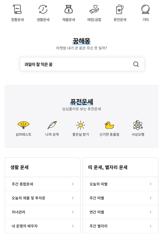 6. 정통운세 외에도 꿈해몽이나 심리테스트, 생활 운세 등 다양한 콘텐츠가 마련되어 있습니다. 궁금했던 꿈의 의미를 찾아보거나 가볍게 즐길 수 있는 다른 운세도 확인해 보세요.