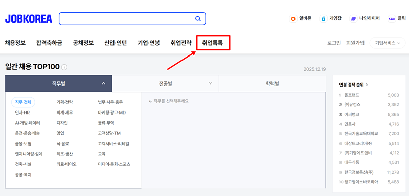 1. 홈페이지 메인 화면 상단을 보시면 채용 정보부터 공채 정보까지 다양한 메뉴가 가로로 나열되어 있어요. 여기서 오른쪽 부분에 위치한 취업톡톡이라는 메뉴를 찾아 선택하면 취업 관련 커뮤니티 공간으로 이동하게 됩니다.