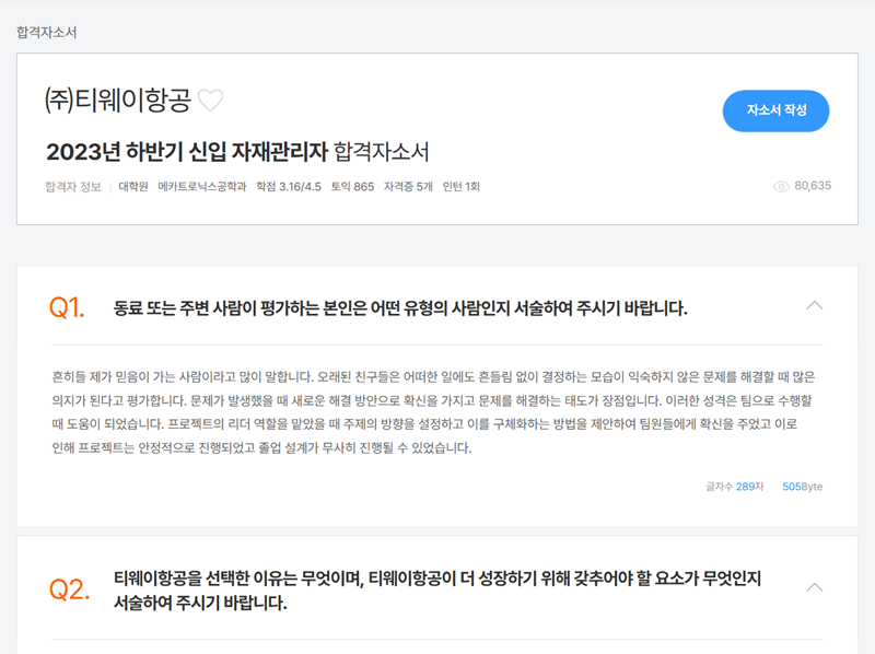 5. 특정 기업을 선택해 들어가면 실제 지원자가 작성한 질문과 답변 내용을 상세하게 볼 수 있어요. 성장 과정이나 지원 동기 같은 항목에서 어떤 에피소드를 활용해 자신을 어필했는지 문장 하나하나 꼼꼼히 읽어보며 팁을 얻을 수 있답니다.