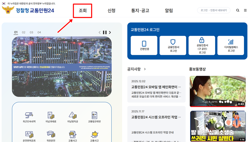 1. 홈페이지 메인 화면에 들어오셨다면 상단 메뉴나 중앙에 위치한 바로가기 항목들을 살펴보세요. 여러 가지 교통 관련 민원 서비스 중에서 우리가 원하는 내역을 바로 조회할 수 있는 메뉴를 찾아 선택하시면 됩니다.