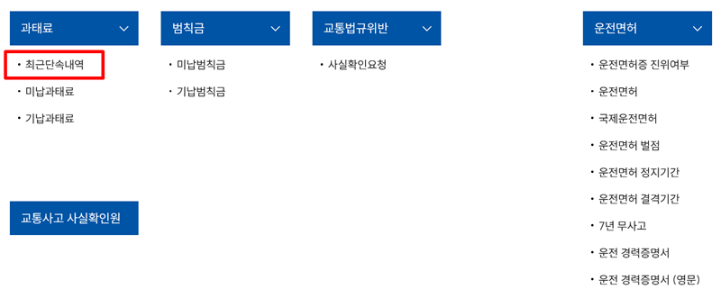 2. 세부 메뉴들이 펼쳐지면 과태료나 범칙금 관련 항목이 보일 거예요. 여기서 가장 최근에 무인 단속 장비에 걸린 내역이 있는지 알아보기 위해 최근단속내역이라는 글자를 찾아 선택해서 넘어가 주세요.