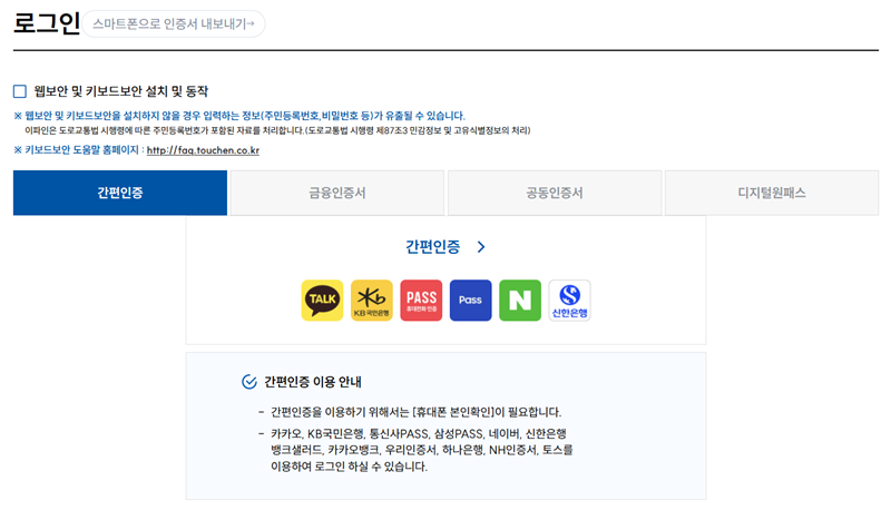 3. 개인 정보가 담긴 민감한 내용을 다루기 때문에 본인 확인 과정이 꼭 필요해요. 간편 인증이나 공동 인증서 등 여러 가지 방법 중 본인이 평소 자주 쓰던 편한 방식을 골라 안전하게 접속을 진행해 주시면 됩니다.