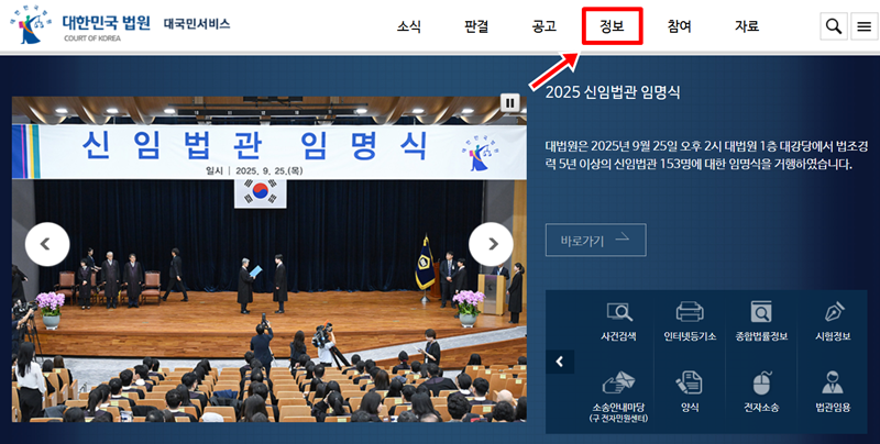 1. 대한민국 법원 홈페이지 상단 메뉴 중 정보 항목을 통해 재판과 관련된 여러가지 내용들을 찾아볼 수 있습니다. 이곳에서 사건을 찾아보는 것과 관련된 항목으로 이동할 수 있습니다.