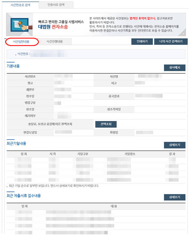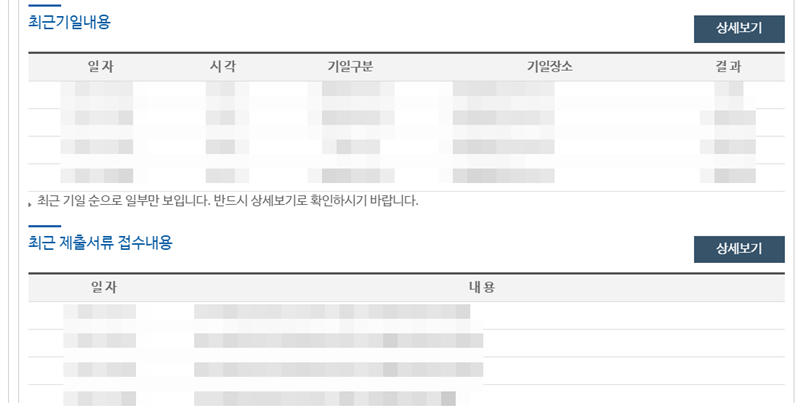 6. 같은 화면에서 아래로 내려가면 최근기일내용과 최근 제출서류 접수내용을 볼 수 있습니다. 다음 재판 날짜나 최근에 어떤 서류가 오고 갔는지 빠르게 확인할 수 있어 편리합니다.