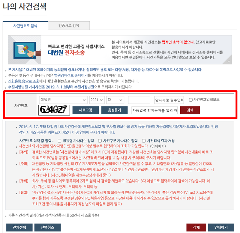 3. 사건번호로 검색하는 화면이 나타나면 법원명, 연도, 사건번호 등을 정확하게 기입한 후 당사자명을 입력합니다. 그리고 자동입력 방지문자를 넣고 검색을 하면 결과를 볼 수 있습니다.