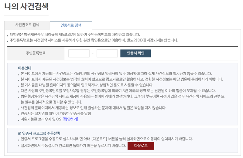 4. 만약 사건번호를 모른다면 인증서로 검색하는 방법도 있습니다. 주민등록번호를 입력하고 인증서 확인을 거치면 본인과 관련된 사건 목록을 조회하여 진행 상황을 파악할 수 있습니다.