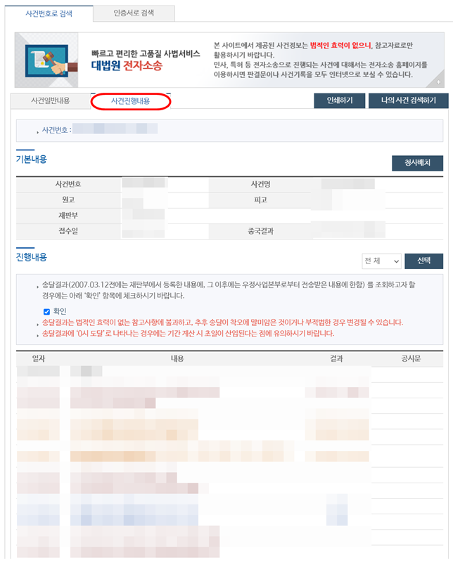7. 사건의 구체적인 진행 과정을 시간 순서대로 보고 싶다면 사건진행내용 부분을 확인하면 됩니다. 송달 결과부터 재판부의 결정까지 모든 과정을 상세하게 살펴볼 수 있습니다.