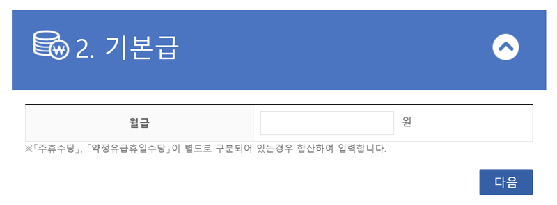 2. 다음으로 기본급을 입력하는 단계예요. 본인의 급여 명세서를 참고해서 매달 고정적으로 들어오는 기본 월급 액수를 적으면 되는데, 주휴수당이나 약정 유급 휴일 수당 같은 항목이 따로 구분되어 있다면 합쳐서 적어주시면 돼요.