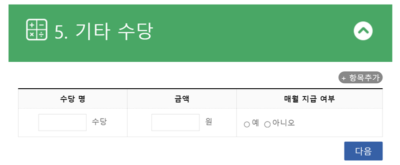 5. 앞서 입력한 항목 외에도 직책 수당이나 위험 수당처럼 별도로 받는 돈이 있을 수 있어요. 급여 명세서에 찍히는 기타 수당들이 있다면 항목 추가를 통해 빠짐없이 금액을 적어주셔야 더 정확한 계산이 가능합니다.