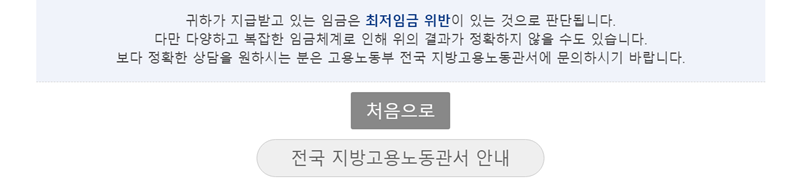 7. 모든 정보를 넣고 확인을 누르면 결과가 나옵니다. 지금 받는 돈이 법 기준에 맞는지, 아니면 위반 소지가 있는지 바로 알려줘요. 만약 문제가 있다면 구체적인 상담을 받아볼 수 있도록 안내도 해줍니다.