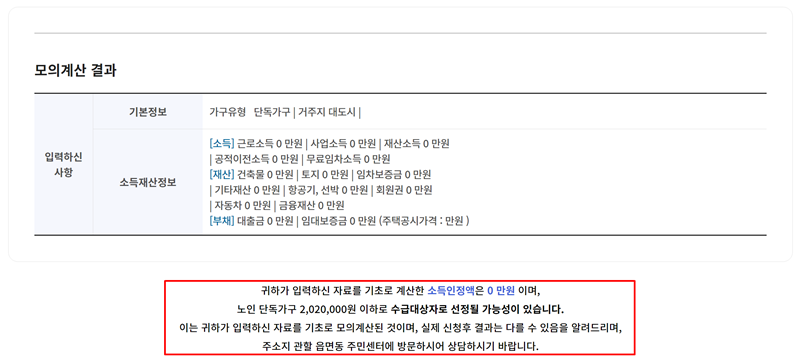 6. 모든 정보를 바탕으로 계산된 결과가 화면에 나타납니다. 내가 입력한 내용을 요약해서 보여주고, 산출된 소득인정액을 기준으로 기초연금 수급 대상자에 선정될 가능성이 있는지를 알려줍니다.
