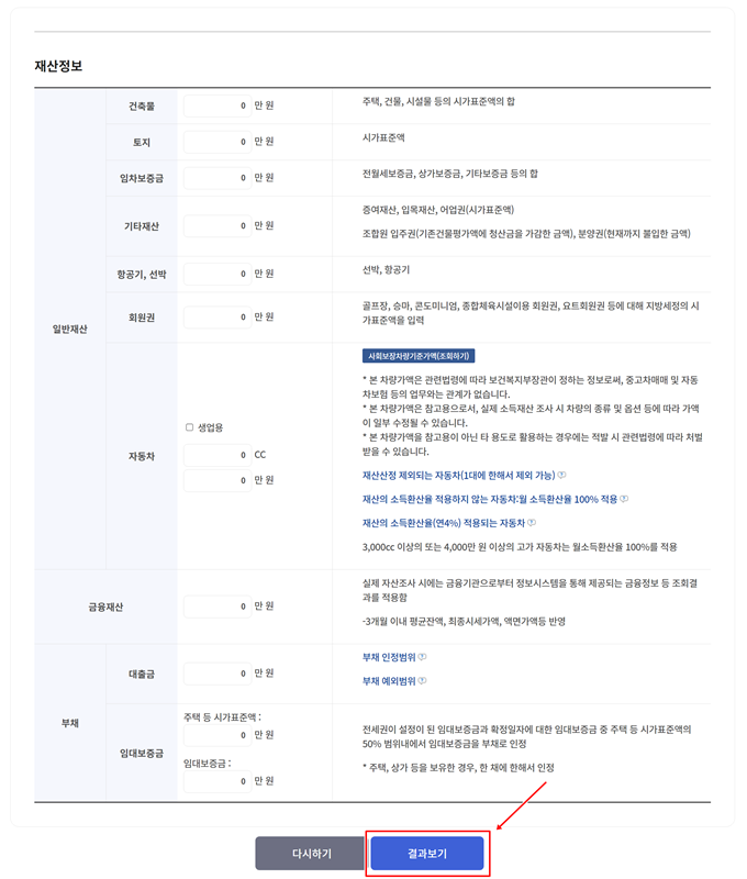 5. 소득 정보 입력이 끝나면 재산 정보를 기입합니다. 건축물이나 토지 같은 일반재산부터 금융재산, 그리고 부채까지 빠짐없이 입력한 뒤, 화면 아래에 있는 '결과보기'를 눌러주세요.