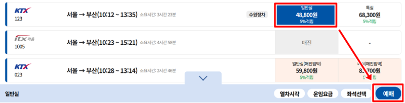 3. 원하는 시간대의 열차를 골랐다면, 일반실이나 특실 중 원하는 좌석의 요금을 확인하고 '예매'를 선택하여 다음 단계로 진행합니다. 이 과정에서 적용되는 할인 혜택이 있다면 함께 표시되니 꼼꼼히 살펴보는 것이 좋습니다.